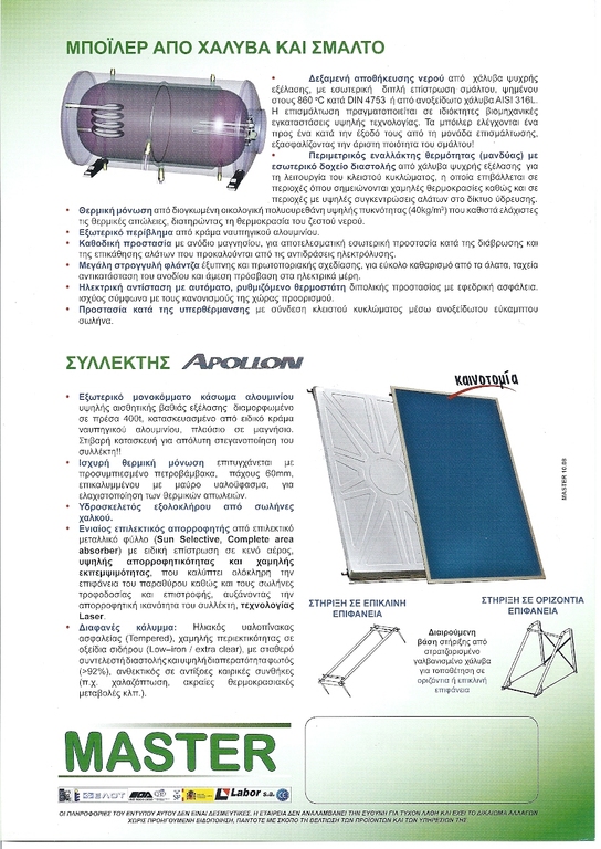 Master 160 λίτρα διπλής ενεργείας glass boiler ( Μπόιλερ ) Ηλιακός με επιλεκτικό συλλέκτη apollon 2,6 m²
